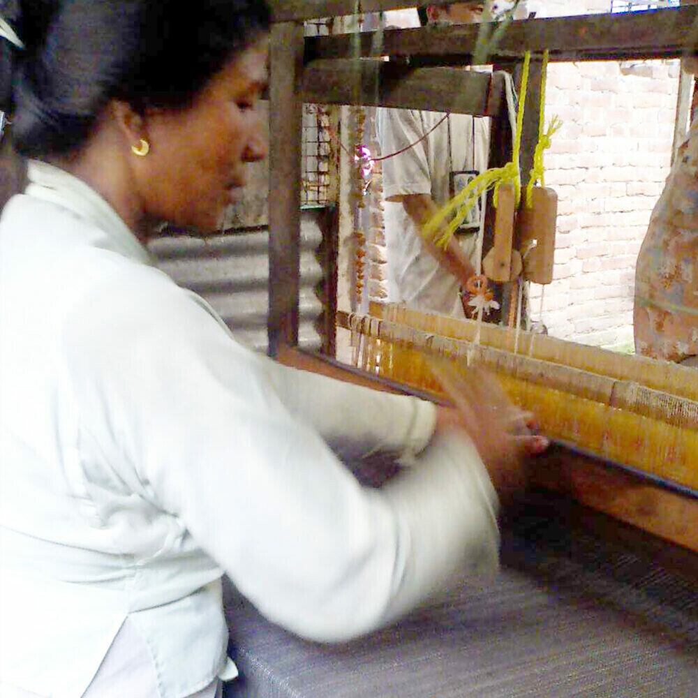 木の織り機を使って一枚の生地を織っていくのは、かなりの根気と体力が必要なんです。